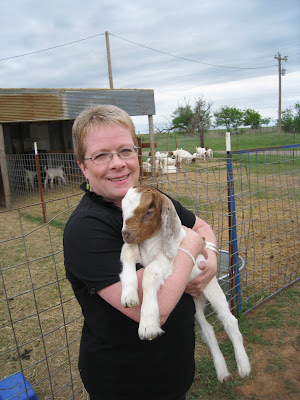 Everyone say "hi Jared!". He is a hoot and a half. We talked and laughed and stuffed our faces for I don't know how long. All too soon, though, it was time for another two hour drive home. Graduation day is tomorrow.Wouldn't you know that everywhere I go I take cold weather with me. It really stinks. It was 90 when I got there on Thursday and by Saturday at her outdoor graduation it was 64, cloudy and windy. Yay us. We made it through(barely) and were ready to party. Renee and Jeremy were having a barbecue at their house to celebrate but before everyone got there we had to head out to the goat farm. Yep, that's right. Jeremy's family raises goats and the two of them are right in the middle of it. Never in my wildest dreams did I think Renee would be caught dead herding goats but there, right before my eyes, were the two of them trying to get this goat.